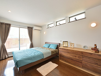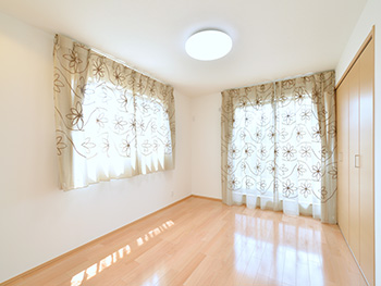 | 施主様こだわりのカーテンが付いたお部屋です。クローゼット完備で収納力も抜群です。 | 寝室は木目を基調とした、少し落ち着いたカラーでまとめました。 |